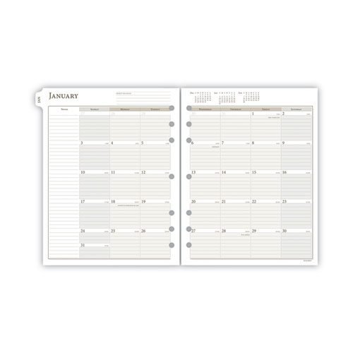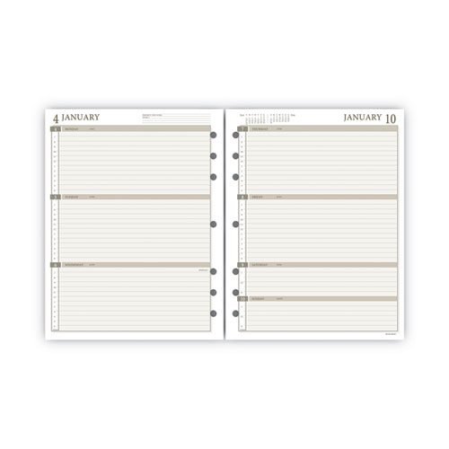 Refill covers a 12-month date range January to December with Julian dates. High-quality paper features superior ink bleed resistance. One week per two-page spread has hourly appointments from 7:00 a.m to 6:00 p.m. Monday through Friday, while weekends are condensed with 7:00 a.m., 12:00 p.m. and 6:00 p.m. ticks. Tabbed one month per two-page spread features ruled daily blocks for detailed planning and a column for notes. Pre-punched for use in a 7-ring planner, sold separately.