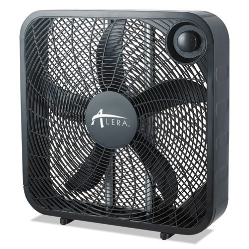 Slim-profile box fan takes up less space than conventional designs.
