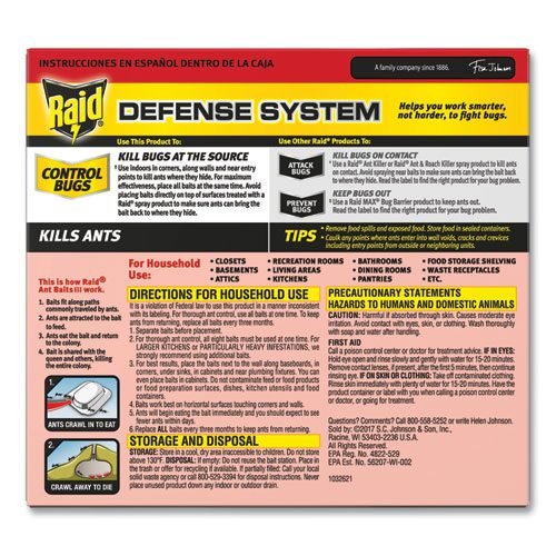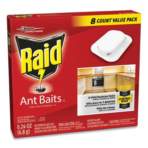 Raid Ant Baits III with adhesive secures bait under your countertops and on your walls to kill ants where they hide for up to three months. After ants feed on the bait, they return to the colony and transfer the bait to the queen and the other ants, thereby killing the entire colony. Child resistant. Read label before use. Use only as directed.