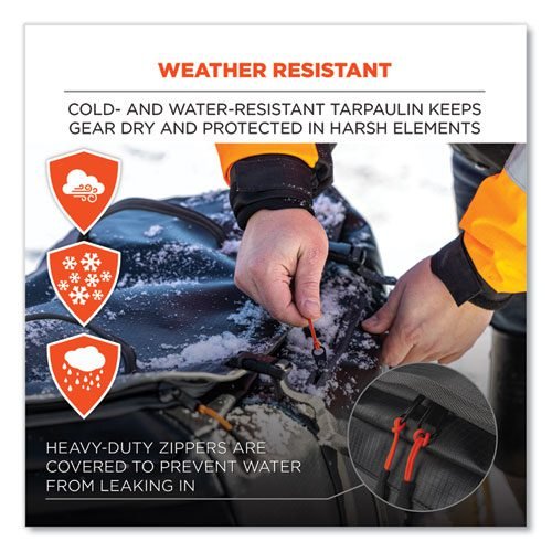 Heavy-duty cold- and water-resistant tarpaulin with 600D coated polyester keeps gear dry and protected in wet or snowy conditions.
