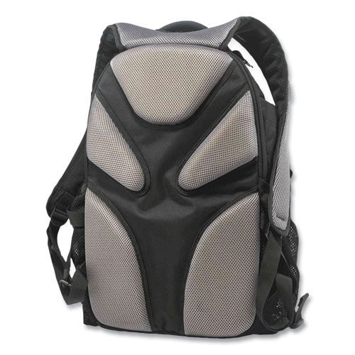 Mobile Office Backpack offers a comfortable way to transport laptops, tablets, and other office supplies. 1,200D ballistic polyester with water-resistant backing. Four main compartments including reinforced computer sleeve. Two vertical side pockets with storm drain ventilation. Crush-proof top container for eyewear and other items. Personal items pocket with headphones port. Padded shoulder straps for increased comfort under heavy weight. Cushioned back padding with airflow design for ventilation. Strong YKK zippers.