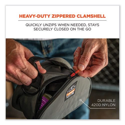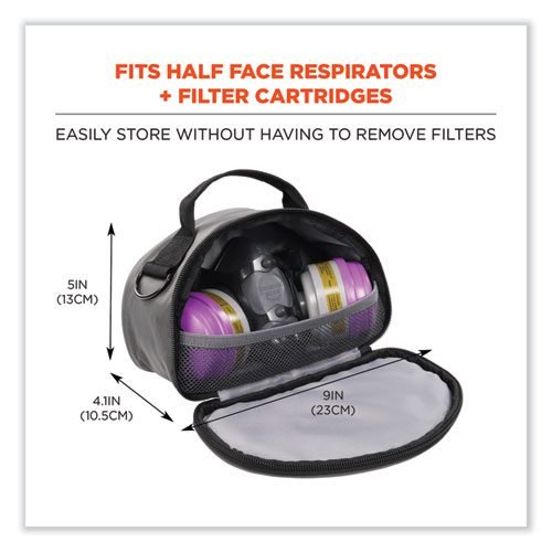 The Arsenal 5187 Half Face Respirator Bag is a step above your standard issue bag with a durable yet lightweight 420D nylon exterior and a 200D lining to protect expensive half face respirators. An easy-open zippered clamshell and belt loop make for quick, one-handed access on the go. A webbing belt loop allows the bag to securely thread through belts for on-the-hip storage. The loop can also be used to secure the bag to equipment. A carrying handle makes for easy grab-and-go transport. An elastic interior pocket securely stores respirator filters, cartridges and other small accessories. The external D-rings can be used to clip keys, glove clips or shoulder straps (not included). The clamshell bag is ideal for those working in industries such as construction, mining, oil and gas, agriculture, firefighting, painting and woodworking.