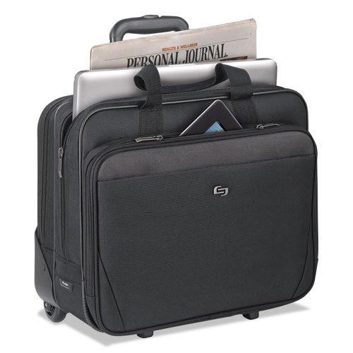Fully padded 17.3″ laptop compartment. Internal iPadĀ®/tablet pocket. Front zippered pocket. Front zip-down organizer section with key clip. Divided file compartment. Padded carry handles. Hidden push-button telescoping handle system. Inline skate wheels.