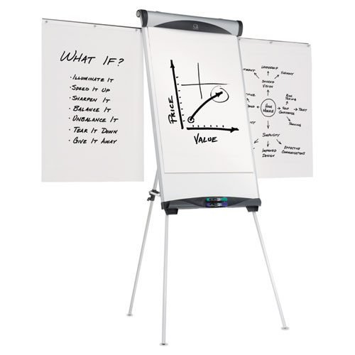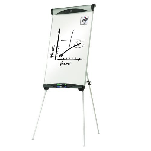Collapsible easel with smooth magnetic whiteboard is designed for streamlined presentations. Delivers effective performance when collaboration is needed in occasional-use work environments. Steel-backed magnetic surface doubles as a bulletin board. Adjustable hooks and clamp hold standard-sized flipcharts for easy sheet tear-away. Extendable and retractable arms displays three sheets of paper simultaneously. Extend surface life with regular cleanings, using Quartet® cleaning solutions. Sturdy tripod base and telescoping legs increase stability, prevents skidding while protecting floors against scratching. Collapses for easy storage, transport and tabletop use. Height adjusts up to 73 1/2″. Sleek Euro™ design with brushed aluminum finish. Includes built-in marker clip and tray that conveniently stores markers and other accessories.