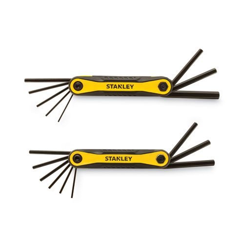 The STANLEY® Folding Metric and SAE Hex Keys feature durable composite construction. The rubber side inserts allow for a secure grip and the chamfered edge helps guide the wrench for a smooth, easy entry of the hex key. It has size markings printed on the hex key body for easy identification.