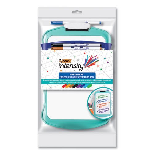 From at-home learning with young kids to leaving a quick message before you leave home or simply scribbling a quick status, the BIC® Intensity® Dry Erase Kit makes it convenient and fun. BIC® Intensity® dry erase 2.8 mm bullet tip markers, have a resistant blocked tip that will not retract under pressure and come in (8) vivid colors: Black, (2) Blue, Brown, Green, Navy, Orange, Purple, and Red. Markers are AP certified and conform to ASTM D 4236. Dual-sided dry erase board with both plain and grid lines is break-resistant. Marker storage clip makes keeping dry erase markers together easy.