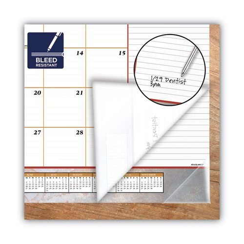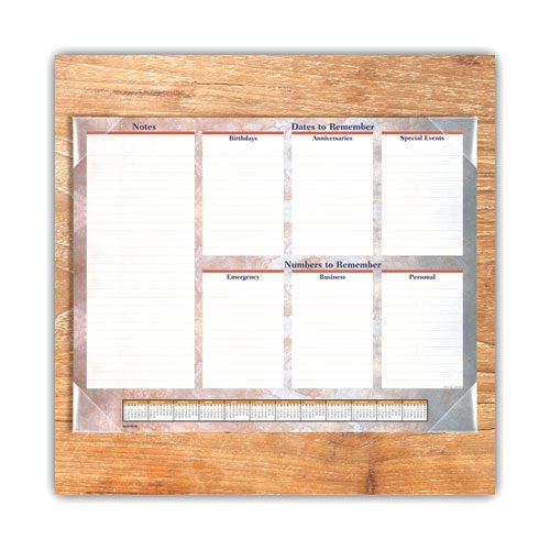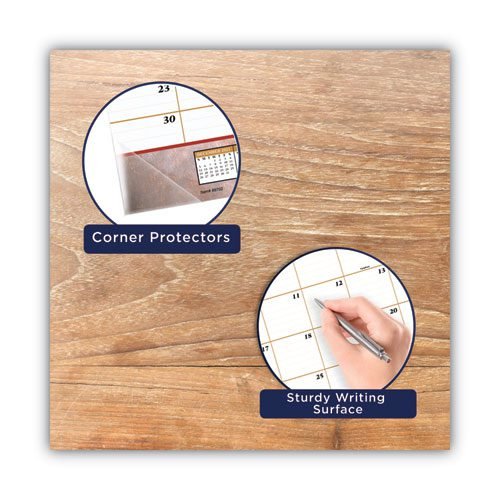 This upscale monthly desk pad covers a full year and has a burgundy marbled design on every page, letting you plan your schedule in style. Pages are printed with a burgundy marble design that will add a touch of modern style to your day. Desk pad covers a 12-month date range January – December. High-quality paper features superior ink bleed resistance. One month per page format has ruled daily blocks, a column for notes and full year of reference calendar blocks. Special features include a durable backboard for sturdy writing, bonus pages for notes, phone numbers, and important dates, and four clear corner protectors. Pages measure 21.75″ x 17″.