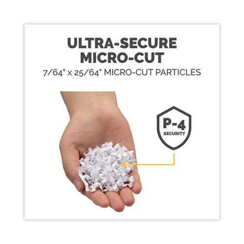 Shreds 10 sheets per pass into 7/64″ x 25/64″ micro-cut particles (Security Level P-4).