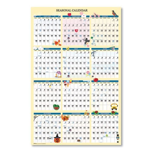 House of Doolitttle 100% Recycled Seasonal Laminated Erasable Wall Calendar. Colorful monthly images that depict each month’s special holiday and season with bright lively designs on a full year view. This wall calendar is reversible, horizontal one side, vertical on reverse to fit any office design. Laminated write-on/wipe-off surface easily erases with a damp cloth for changing plans. Includes a black water-soluble marker and hanging tabs. Printed on 100% recycled paper with soy-based inks.
