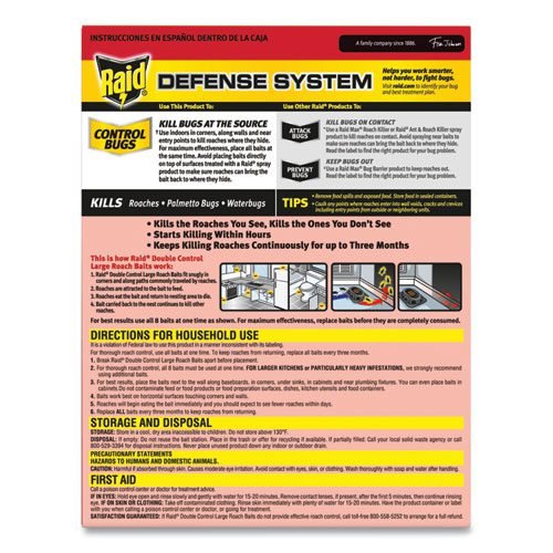 Raid® Double Control Roach Baits kill the roaches you see as well as the ones you don’t see with two types of bait. After roaches feed on the bait, they return to the nest and transfer the bait to the others. Population reduction and less activity can be expected within days, with the baits working continuously for up to three months. Raid® Double Control Roach Baits are child-resistant. Read label before use. Use only as directed.