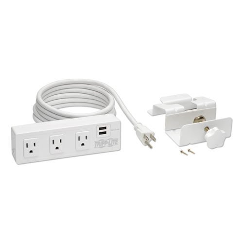The 510-joule rating means your computer, printer, scanner, external hard drive and other sensitive electronic components are protected against strong surges and spikes. This power surge protector with USB ports features full normal mode (H-N) and common mode (N-G/H-G) line surge suppression. It filters out disruptive EMI/RFI line noise that can cause equipment damage or data loss and exceeds IEEE 587 Category A and B surge suppression specifications. Features two USB ports that produce 3.1A of combined power to charge your mobile devices, including smartphones, tablets and MP3 players. A top storage shelf holds smartphones and other small devices while they’re charging. Three-plug surge protector mounts to a clamp that attaches to most desks, tables and flat surfaces, bringing power and device charging to your desktop. The ten-foot power cord has a NEMA 5-15P plug and fits through the back of the clamp to reduce cable clutter. Tripp Lite will repair or replace any connected equipment damaged by surges, including direct lightning strikes, up to $20,000 for life (valid in the U.S., Canada and Puerto Rico only.)