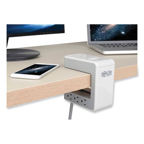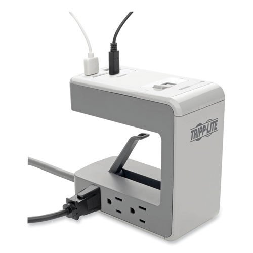 Six NEMA 5-15R outlets distribute AC power to connected home/office equipment. 1080 joules protect your valuable electronics against dangerous surges and spikes. Two USB-A and one USB-C ports for fast charging of phones, tablets and other mobile devices. Eight-foot pivoting power cord with NEMA 5-15P plug easily adjusts to nearby wall outlets. Spring-loaded clamp attaches to flat surface up to 2.5 in. thick for use anywhere. Filter potentially damaging line noise to improve connected equipment’s performance and lifespan. Safeguard valuable data against damage stemming from unexpected surges.